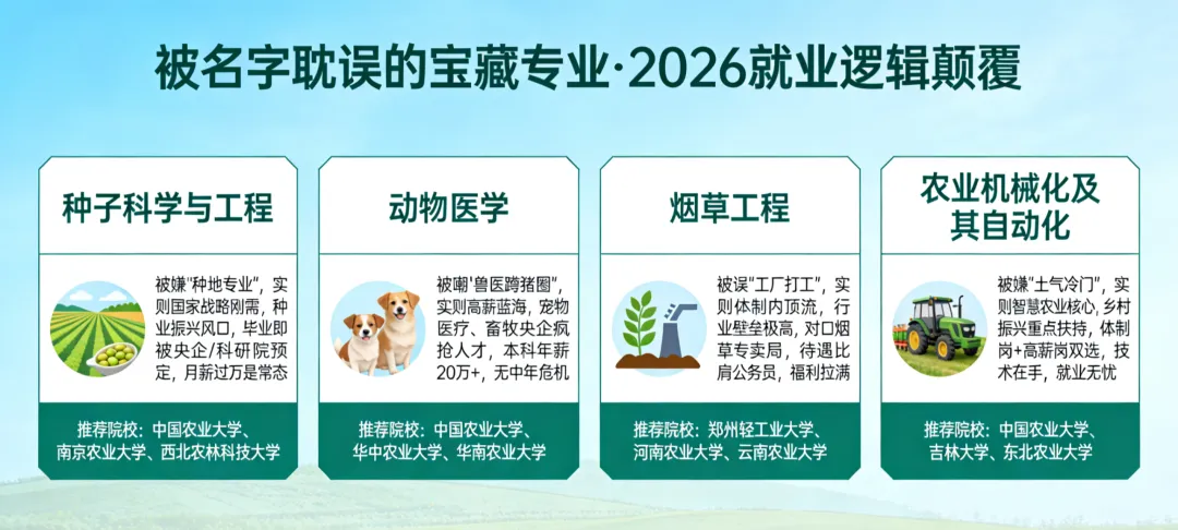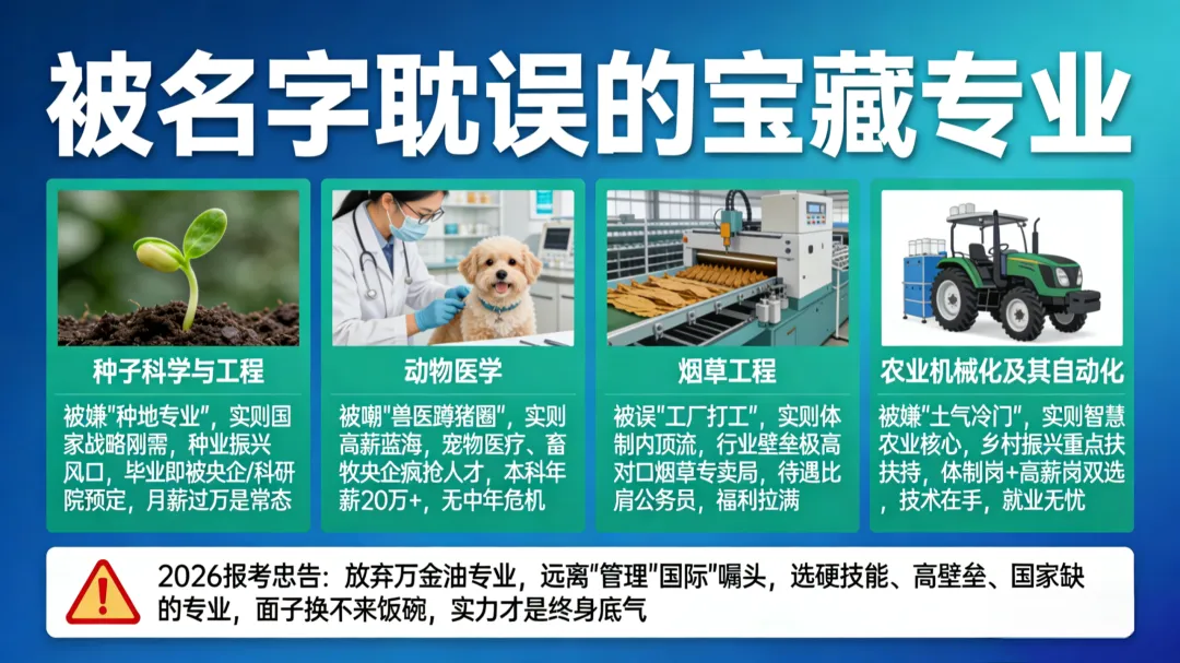 还在挤破头抢金融、计算机、人工智能的“黄金赛道”?别让路径依赖毁了孩子!2026年的就业市场,逻辑早已彻底改写。如今的就业市场,专业名称的“好听度”,早已和就业好坏脱钩。那些听起来高大上的“万金油”专业,可能毕业即失业;反倒是这些名字土气、听着像“搞副业”的专业,因为门槛高、需求硬,成了真正的铁饭碗。01 误区:“不务正业” = 没前途?真相:被误解的阶层跃迁秘密通道!这类面向国家战略、服务实体产业的“窄口径”专业,连续多年就业率稳居**95%-100%**区间,就业对口率与起薪,远超文科大类。尤其在2026年体制内门槛收紧、“铁饭碗”趋于“瓷化”的背景下,这种高壁垒、强刚需的专业,反而成了抗风险能力最强的避风港。 02 案例:从“被嘲笑”到“被仰望”,面子换不来真金白银我有位学生,当年高考顶着全家压力报考动物医学(宠物方向)。整个暑假都活在亲戚的嘲讽里:“好好的大学不上,非要去给猫狗看病,以后能有什么出息?”去年毕业,他凭借扎实的临床技术,直接被国内头部宠物医疗集团签约,起薪1.2万,转正后年薪轻松突破20万,期权、福利齐全。 反观当年那些读“国际贸易”、“工商管理”的同学,有的在写字楼做着可被替代的基础工作,有的还在考公大军里千军万马过独木桥,看他的眼神,早已从鄙夷变成了羡慕。这就是现实:2026年选专业,选的是“生存空间”,不是“面子工程”。03 重点:这3个“被名字耽误”的专业,2026必看!- 核心价值:粮食安全是国家最高战略。随着种业振兴行动深入,这个专业被誉为“农业芯片”。- 就业前景:未毕业就被中化集团、隆平高科、各大农科院科研岗预定。工作稳定,编制内待遇优厚,手握核心技术,绝对铁饭碗。- 核心价值:行业壁垒极高,全国开设院校极少,属于“专卖体制”下的特殊专业。- 就业前景:对口烟草专卖局、中烟工业等体制内核心单位,薪资待遇处于行业顶端,福利完善,是真正的“神仙工作”。- 核心价值:乡村振兴、智慧农业的核心支撑。对标国家电网、大型农机企业、农业农村局。- 就业前景:懂机械又懂农业的复合型人才极度紧缺,岗位含金量高,不仅能进体制,还能在新能源农机赛道拿高薪。1. 彻底抛弃“面子崇拜”:工商管理、市场营销、公共管理等“管理类”大专业,无核心技能,2026年就业内卷最严重,能避则避。2. 拥抱“硬技能”赛道:选择那些名字土、门槛高、国家缺的硬核工科与农科。它们可能不光鲜,但能给你一辈子的安全感。3. 跳出圈层看未来:亲戚的建议基于20年前的经验,时代变了,赛道变了,孩子的未来需要用更长远的战略眼光去布局。2026年,与其在热门赛道里做被收割的“分母”,不如在这些被低估的潜力赛道做稳赢的“分子”。