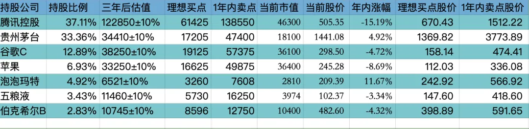 目前十大持仓:腾讯37.11%,贵州茅台33.36%,谷歌12.89%,苹果6.93%,泡泡玛特4.92%,五粮液3.43%,伯克希尔2.83%。目前九大持仓占比88%(其中科技股占比56.93%,白酒股占比36.79%;A股占比36.79%,港股占比42.03%,美股占比22.65%),还有12%观察仓和现金。