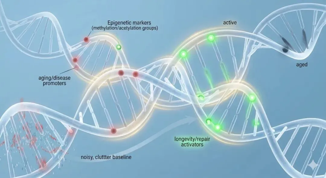 最新研究证实,基因本身(硬件)难以改变,但基因的表达(软件开关)受环境、饮食、心理的剧烈影响。这意味着,你有 80% 的机会通过生活方式的干预,去关闭那些“致病/促衰”基因,打开“长寿/修复”基因。