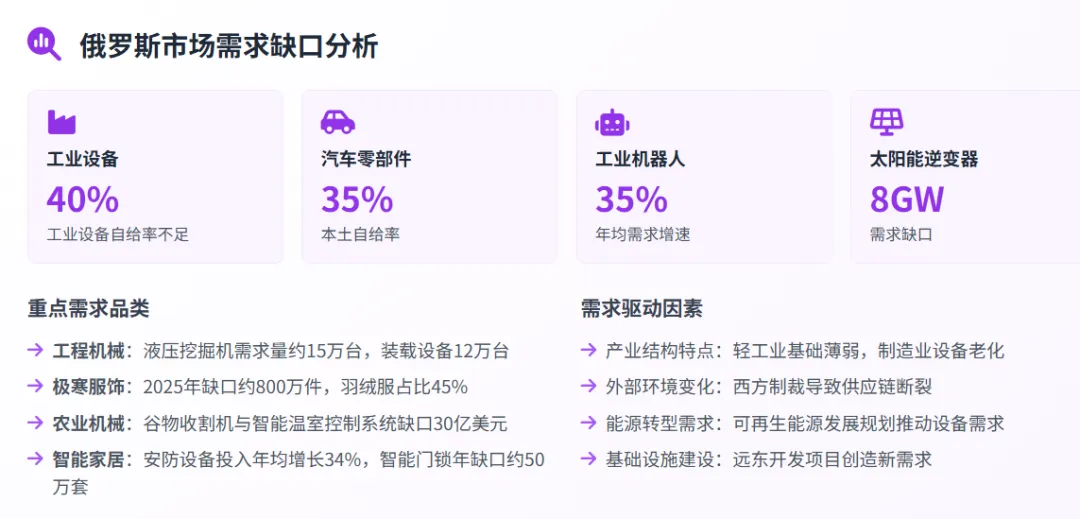 工程机械与建筑设备:俄罗斯基建预算达4.2万亿卢布,远东开发项目设备缺口35%,尤其紧缺可在零下50℃环境中保持85%以上工效的小型挖掘机、塔式起重机、混凝土泵车。2025年缺口量约1.2万台(套),其中耐寒型小型挖掘机缺口占比60%以上,中国三一重工、徐工集团相关产品已占据俄远东地区28%的市场份额,仍有较大供给空间。 汽车及零部件:俄罗斯汽车保有量5450万辆,61.5%为车龄超10年的老旧车辆,零部件需求年均增长2300%;整车市场虽2025年出现阶段性饱和(中国载人汽车出口从2024年110万辆降至63.4万辆),但新能源汽车及核心零部件缺口显著,电动公交、充电桩享受5%低关税及国家补贴,宁德时代动力电池在俄订单较冲突前增长200%,2025年新能源汽车零部件缺口约300万件(套)。 工业自动化设备:受制造业增值税返还政策推动,俄罗斯CNC数控机床进口增长420%,工业机器人年均需求增速达35%,核心缺口为支持俄语界面的工业机器人、高精度数控机床,目前中国工业机器人企业在俄市场份额仅18%,高端市场仍被ABB、西门子占据,缺口量约8000台(套)/年。