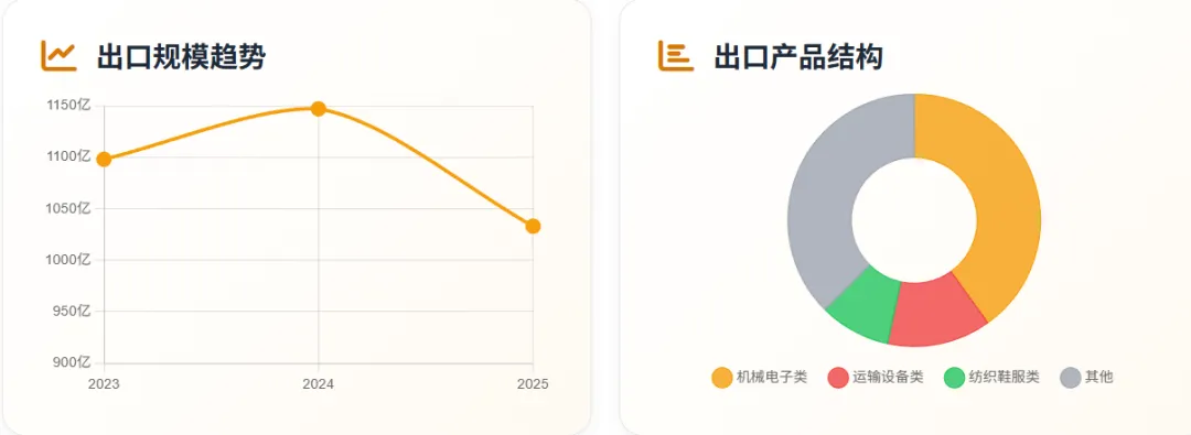 出口规模:2025年对俄出口额约850亿元,占全国对俄出口总额的11.5%,排名全国前三,主要以轻工业产品、机电产品出口为主,同比保持稳定。 主要出口货品:核心品类包括:纺织服装(衬衫、羽绒服、鞋靴)、小家电(电饭煲、电水壶、智能门锁)、电子元器件、食品加工设备、家具灯具。 海关登记量:全年出口货物量约900万吨,其中纺织服装出口额约300亿元,小家电出口额约200亿元,食品加工设备出口额约50亿元(含模块化乳制品生产线);主要出口口岸为宁波港、舟山港,跨境电商出口占比约25%(主要通过Temu、AliExpress平台)。