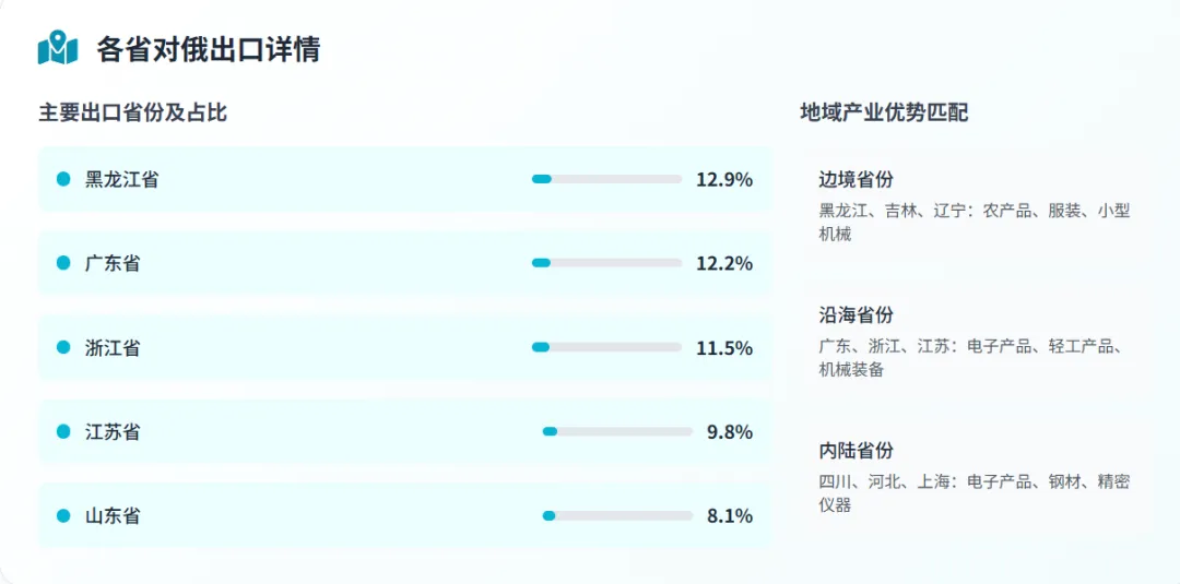 出口规模:2025年上半年进出口总值1601.2亿元,同比增长2.4%,其中出口466.8亿元,同比增长16.9%(全年预计出口950亿元左右),占全国对俄出口总额的12.9%,排名全国前列。 主要出口货品:依托边境优势,以民生消费品、农业产品、轻工业产品为主,核心品类包括:服装服饰(极寒羽绒服、保暖内衣)、农产品(东北大米、马铃薯、果蔬)、小家电(电热毯、电煮锅)、木材加工制品、小型机械及零部件。 海关登记量:全年出口货物量约1200万吨,其中农产品出口量约300万吨(东北大米约15万吨),服装服饰出口量约200万件,小家电出口量约80万台;主要出口口岸为绥芬河、黑河、满洲里,其中绥芬河口岸出口量占全省对俄出口总量的60%。