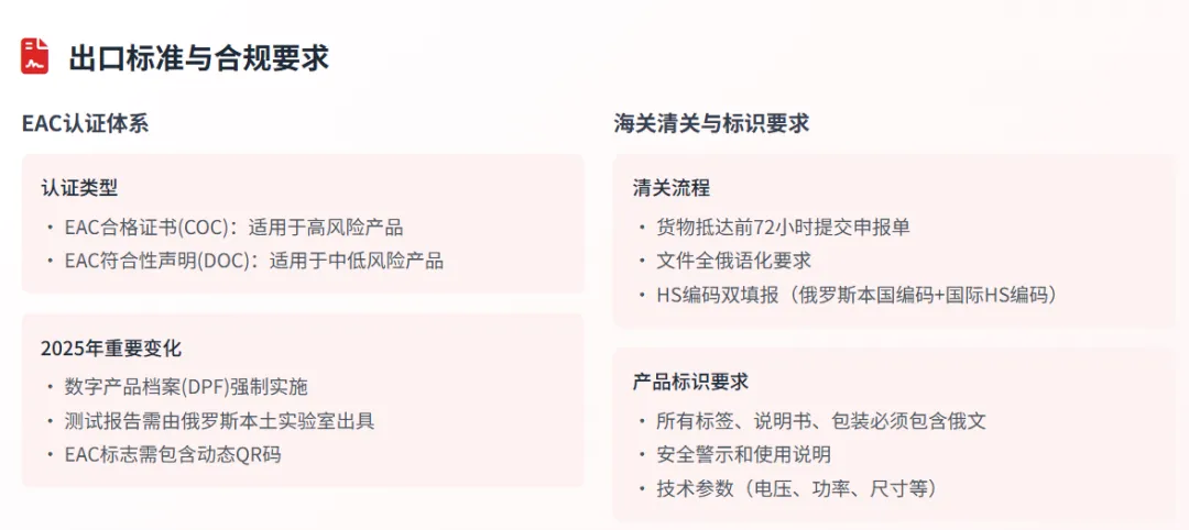 政策风险:俄罗斯及欧亚经济联盟技术法规可能更新,EAC认证标准及流程可能调整,需及时关注官方动态,避免因标准不符导致货物被扣。 市场风险:2025年运输设备出口出现阶段性收缩,部分品类(如汽车)可能面临市场饱和,需关注品类需求变化,及时调整出口结构。 合规风险:文件不完整、俄文翻译错误、产品标识不合规等均可能导致清关延误,增加出口成本;部分高风险产品若误选认证类型,可能面临退运风险。