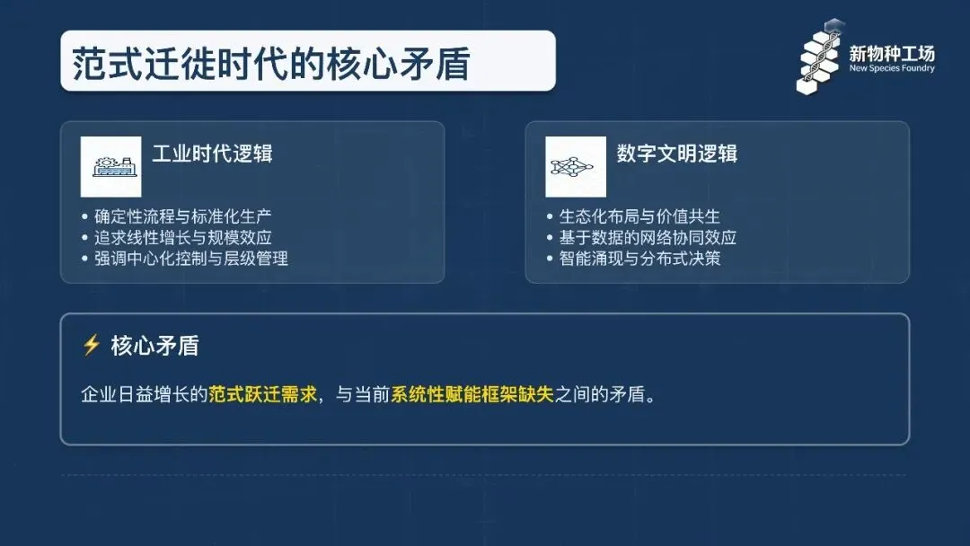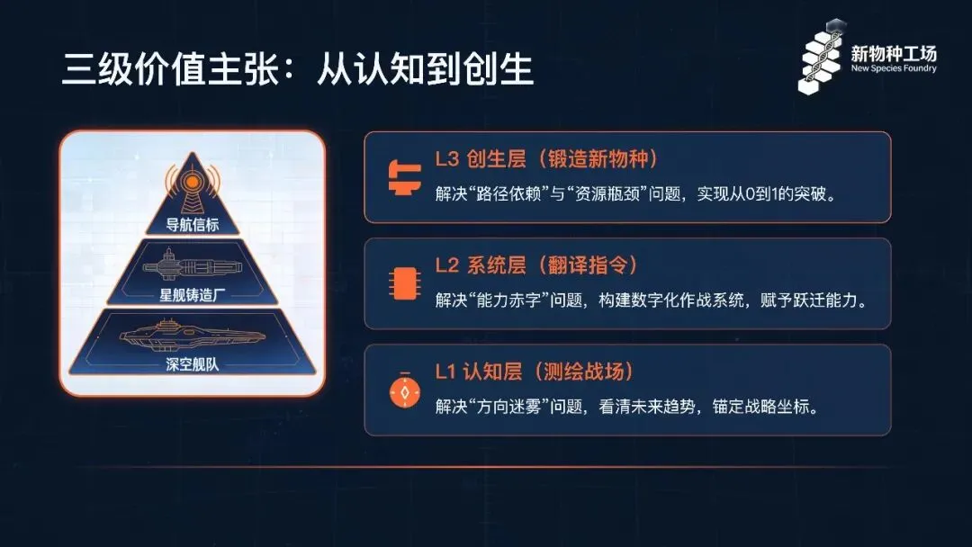 L1 认知层(测绘战场): 提供超越市场噪声的变革信号与底层逻辑解读,解决“方向迷雾”问题。 L2 系统层(翻译指令): 交付完整的“新物种”构建方法论与持续进化的实践社群,解决“能力赤字”问题。 L3 创生层(锻造新物种): 针对具体瓶颈或从零开始的创生过程,提供深度、长期的专项干预与联合创造,解决“路径依赖”与“资源瓶颈”问题。