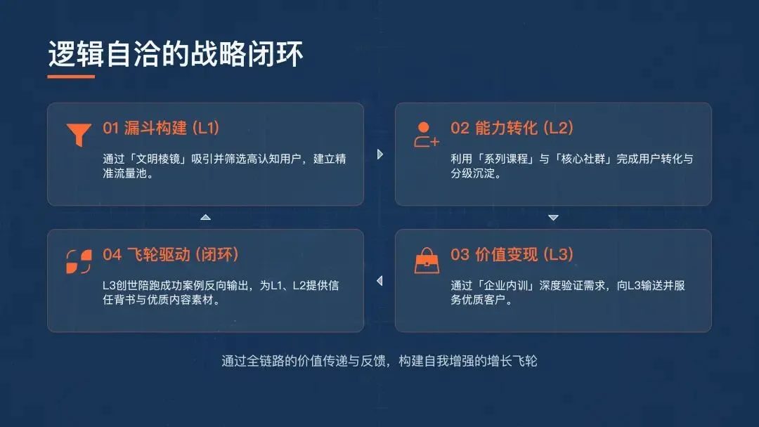 漏斗构建: 通过「文明棱镜」(L1)广泛吸引并筛选高认知用户。 能力转化与沉淀: 通过「系列课程」与「核心社群」(L2)将潜在客户转化为方法论掌握者与品牌认同者,并在此过程中完成客户分级。 价值深化与变现: 通过「企业内训」(L2) 进一步验证需求,最终向「基因编辑手术」、「生态位共建」与「创世陪跑」(L3)输送高意向、高付费能力的优质客户,实现商业价值的深度挖掘。 飞轮驱动: L3层创造的卓越案例,将反向为L1和L2层提供强大的信任背书与内容素材,驱动更多用户进入漏斗,形成增长飞轮。