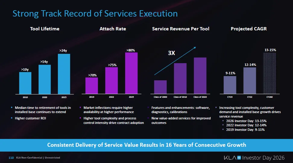 公司预计到2030年半导体设备市场继续扩张,工艺控制强度提升,服务业务依托庞大装机基数形成稳定收入,并推动公司收入与利润显著增长。整体结论是:AI时代真正的确定性赢家,是掌控制造学习速度和良率提升能力的企业,而KLA正围绕这一能力构建长期竞争优势。