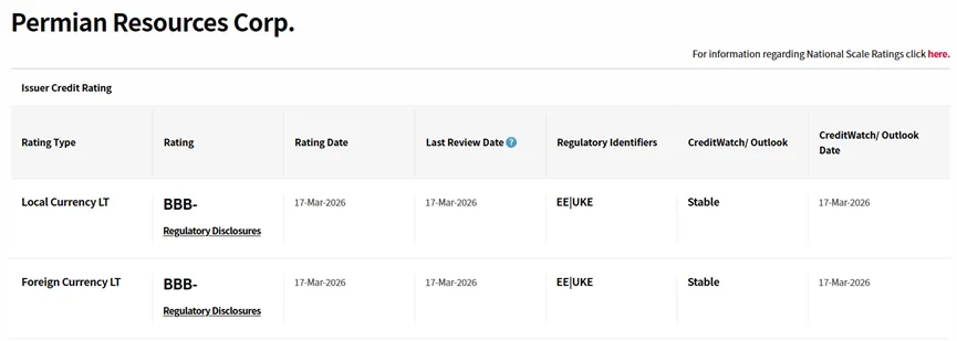 2026 年 3 月 17 日,国际评级巨头标普全球评级发布重磅评级调整公告,将二叠纪资源公司(Permian Resources,PR)的主体信用评级及无担保债务评级从 BB + 正式上调至 BBB-,这也是该公司自 2025 年夏季以来收获的第二次投资级评级上调,至此其已获得标普、惠誉两大评级机构的 BBB - 投资级评级认可,成为二叠纪盆地油气板块中凭借稳健运营实现评级稳步提升的典型代表。
