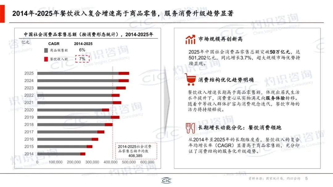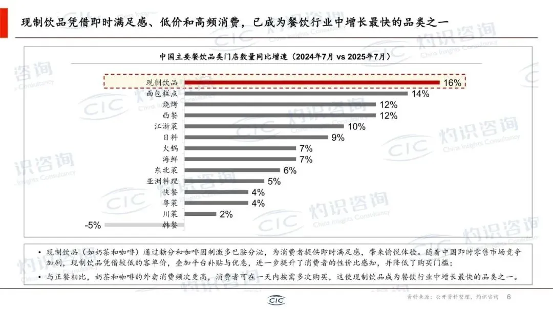 报告显示,尽管宏观经济增速回归平稳,但中国消费市场超大规模优势持续显现。2025年社会消费品零售总额突破50万亿元。消费结构呈现明显的服务化升级趋势,餐饮收入长期增速高于商品零售。在此背景下,现制饮品凭借即时满足感、低价高频和高性价比感知,成为餐饮行业中增长最快的品类之一。2025年,现制茶饮市场规模达5700亿元,在高基数下仍保持稳健增长,持续领先于现磨咖啡赛道,是现制饮品市场的绝对主导力量。