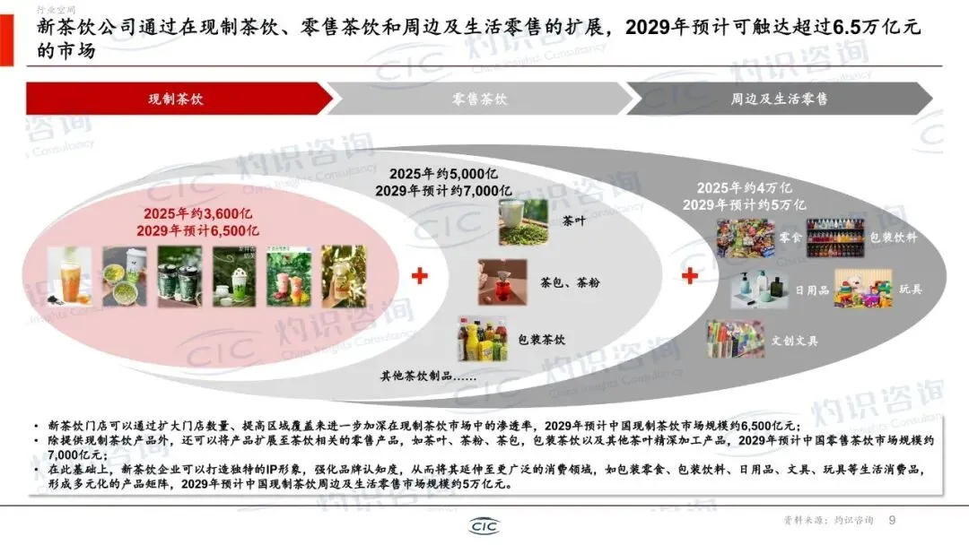 新茶饮行业的想象空间远超门店现制。报告预测,到2029年,中国现制茶饮市场规模预计约6500亿元。更大的机遇在于产业链的延伸:一是向零售茶饮(如茶叶、茶包、包装茶饮)拓展,预计市场规模约7000亿元;二是以品牌IP为核心,延伸至周边及生活零售领域(如零食、日用品、文创等),预计市场规模可达约5万亿元。三者相加,新茶饮企业未来可触达的市场总规模预计超过6.5万亿元,构建起一个庞大的消费生态。
