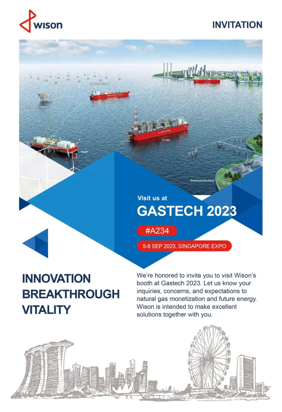 Gastech2023将于9月5日 - 8日在新加坡举办。Wison Offshore & Marine(惠生海工)将在今年的Gastech展会上,面向全球客户和合作伙伴,展示全面的清洁能源解决方案,欢迎前往观展,洽谈合作。更多精彩,敬请期待!