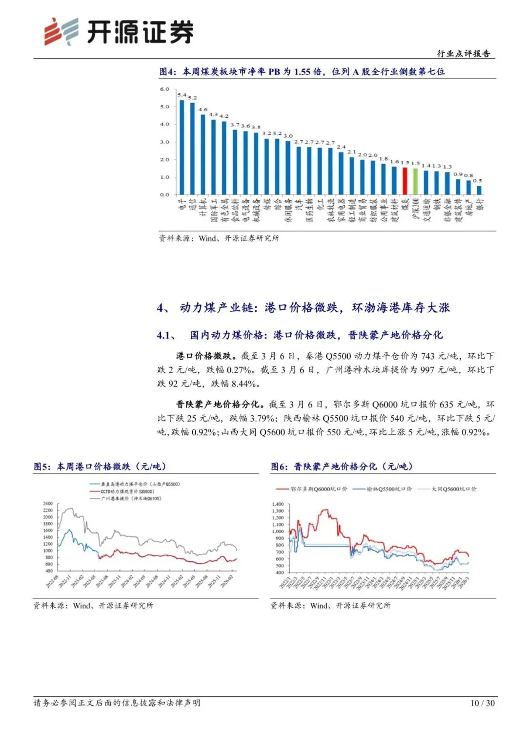 动力煤方面:动力煤价格微跌,截至 3 月 7 日,秦港 Q5500 动力煤平仓价为 743