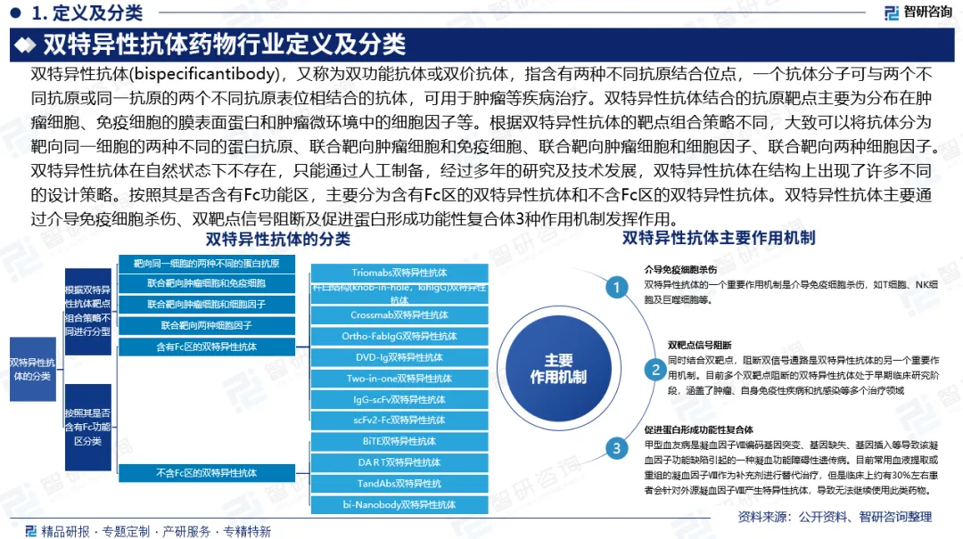行业定义及分类:双特异性抗体指含有两种不同抗原结合位点,一个抗体分子可与两个不同抗原或同一抗原的两个不同抗原表位相结合的抗体,可用于肿瘤等疾病治疗。根据靶点组合策略不同,大致可以将抗体分为靶向同一细胞的两种不同的蛋白抗原、联合靶向肿瘤细胞和免疫细胞、联合靶向肿瘤细胞和细胞因子、联合靶向两种细胞因子。经过多年的研究及技术发展,双特异性抗体在结构上出现了许多不同的设计策略。按照其是否含有Fc功能区,主要分为含有Fc区的双特异性抗体和不含Fc区的双特异性抗体。