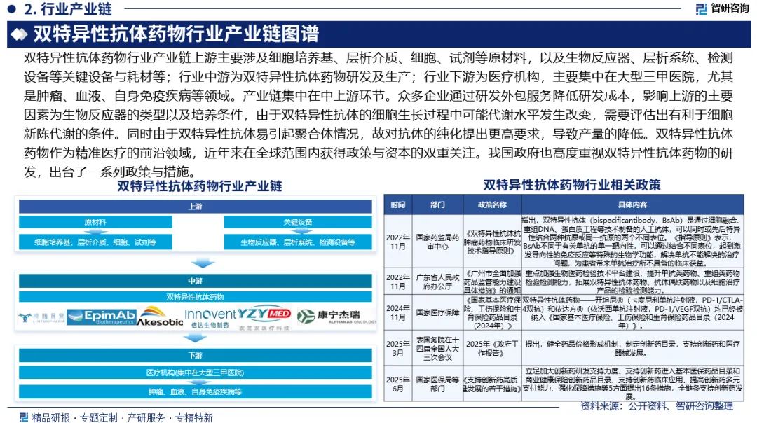 行业相关政策:双特异性抗体药物作为精准医疗的前沿领域,我国政府高度重视双特异性抗体药物的研发,出台了一系列政策与措施。如《双特异性抗体抗肿瘤药物临床研发技术指导原则》《广州市全面加强药品监管能力建设具体措施》的通知《国家基本医疗保险、工伤保险和生育保险药品目录(2024年)》2025年《政府工作报告》《支持创新药高质量发展的若干措施》