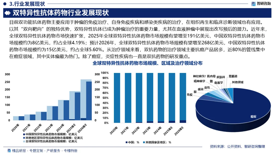 市场规模:近年来,全球双特异性抗体药物市场快速扩张,2025年全球双特异性抗体药物市场规模有望增至191亿美元,中国双特异性抗体药物市场规模约为8亿美元,约占全球4.19%;预计2026年,全球双特异性抗体药物市场规模有望增至268亿美元,中国双特异性抗体药物市场规模约为15亿美元,约占全球5.60%。