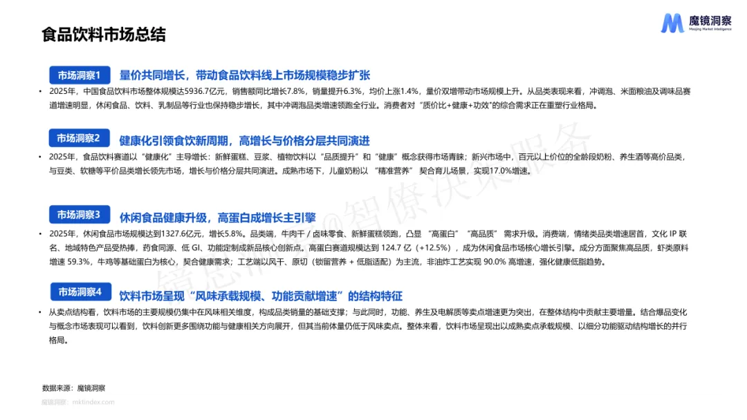•市场规模与增长:2025年中国食品饮料市场整体规模达5936.7亿元,销售额同比增长7.8%,销量提升6.3%,均价上涨1.4%。