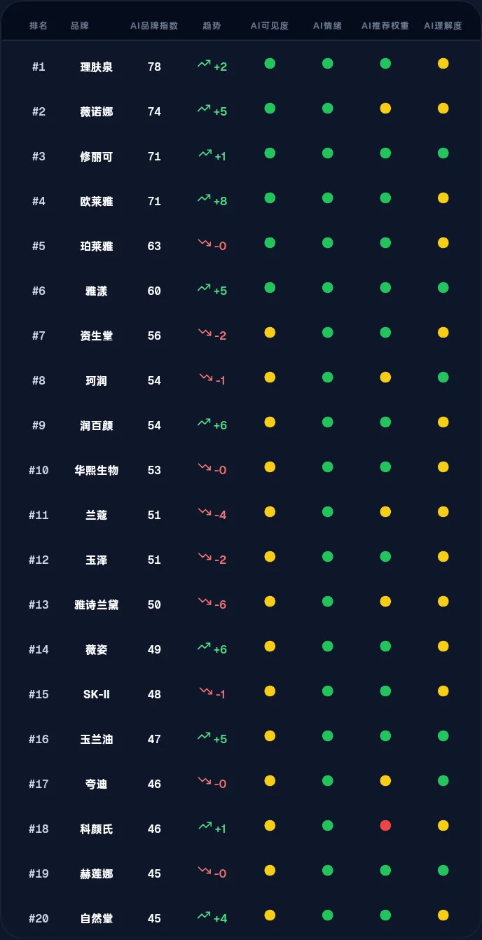 推荐权重:当用户提出“敏感肌用什么”、“抗老精华推荐”等问题时,品牌被AI模型列为推荐选项的优先级和说服力。