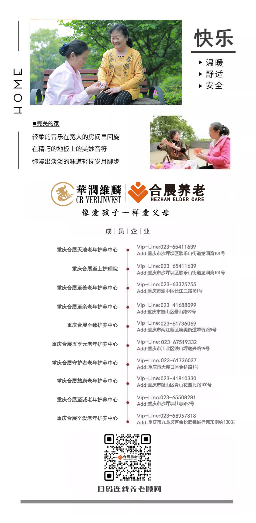 合展养老深耕养老行业十余年,秉持着“像爱孩子一样爱父母”的服务理念, 致力于为更多的养老家庭提供专业、优质的养老服务。