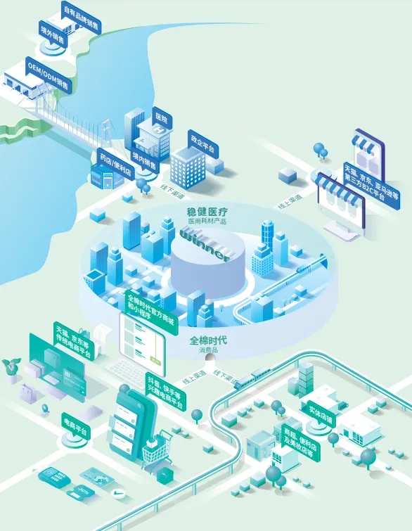 销售方面,“ winner稳健医疗” 在医疗行业建立了专业化的销售网络,覆盖大量医疗机构与零售药店,医用耗材出口至全球多个国家和地区 ;“ Purcotton全棉时代” 在消费品领域采用全渠道销售策略,线上覆盖主流电商平台与社交平台,线下在重点城市开设品牌门店,并进入各类商超和母婴店等终端,通过线上线下融合提升消费者体验与品牌影响力。