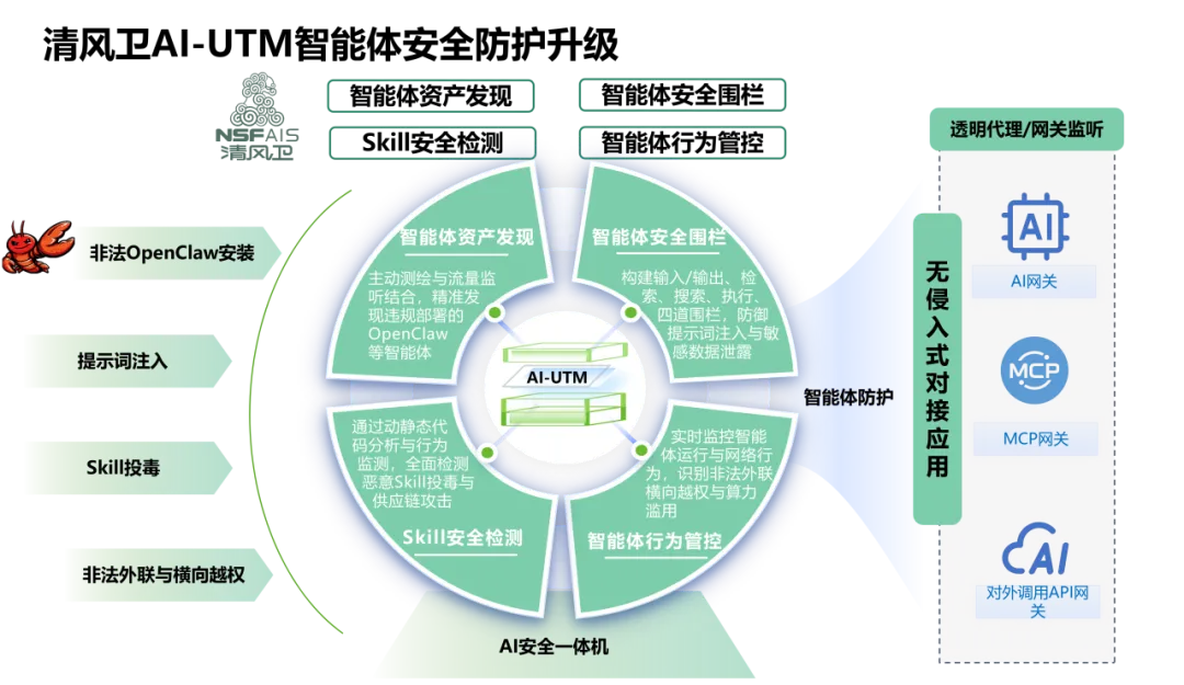 其核心理念是“无侵入、全围栏、管行为”。区别于业界终端方案或开源分支维护模式,“清风卫”AI-UTM通过透明代理与网关监听实现无侵入式对接,彻底规避版本分裂与供应链风险。在能力上,其构建输入/输出、检索、搜索、执行四道安全围栏,防御提示词注入与敏感数据泄露;同时通过智能体资产发现与行为管控,精准监测非法外联、横向越权及Skill投毒等系统级攻击。