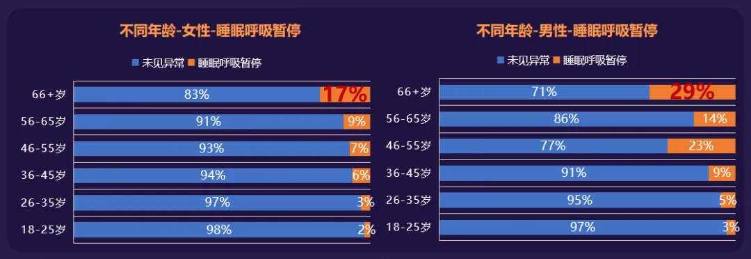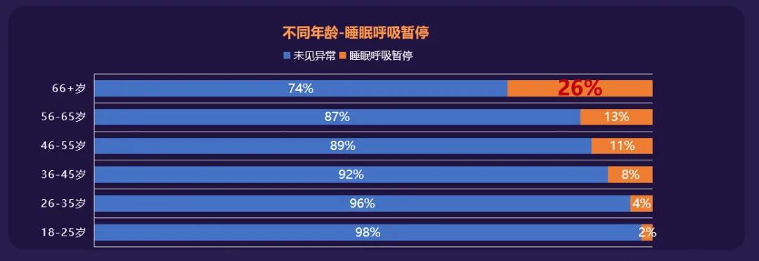 但是,睡眠呼吸暂停风险随年龄上升,66岁及以上人群高达26%。另外,年龄与性别显著影响睡眠呼吸暂停风险,男性风险显著高于女性。