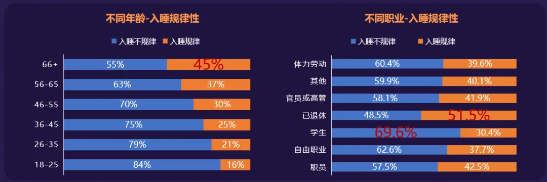 年龄越大,入睡规律占比越高;学生睡眠最不规律,退休人群相对最好。