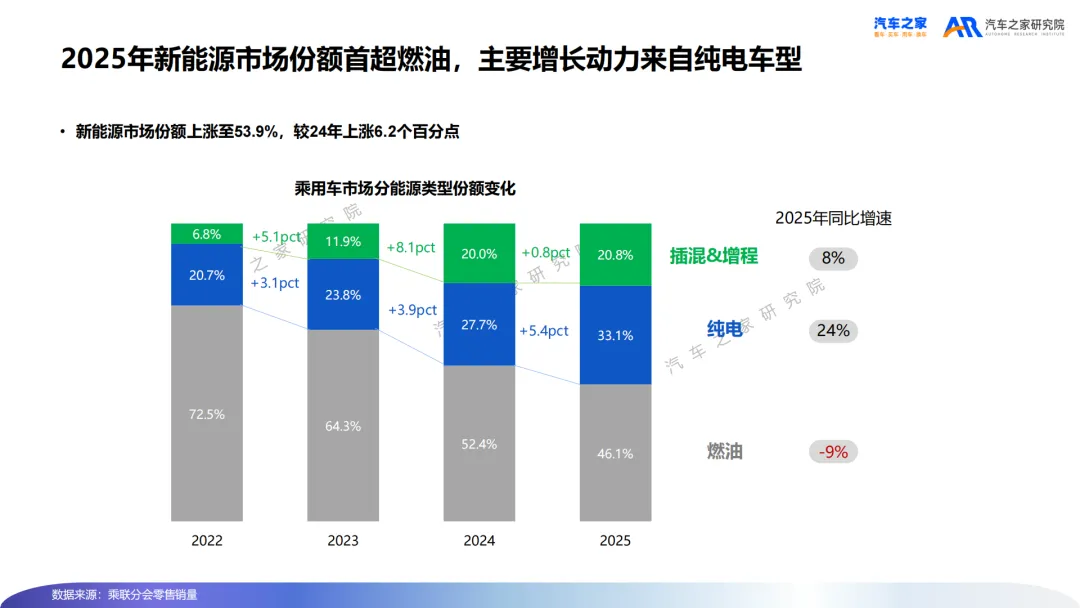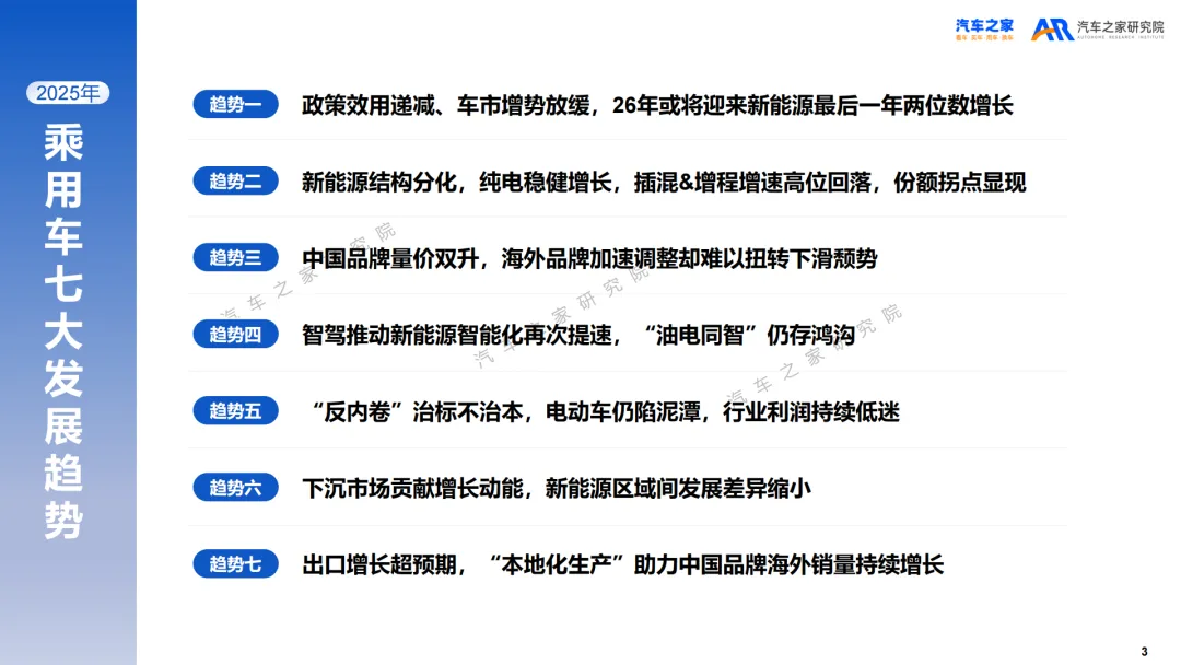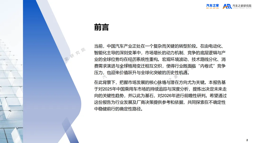 这份报告是汽车之家研究院对 2025 年中国乘用车市场的总结及 2026 年的前瞻性研判,核心围绕行业电动化、智能化转型背景下的七大发展趋势展开,同时明确了 2026 年车市整体增速收窄、新能源发展遇结构调整、中国品牌持续领跑的核心走向,以下是核心内容总结: