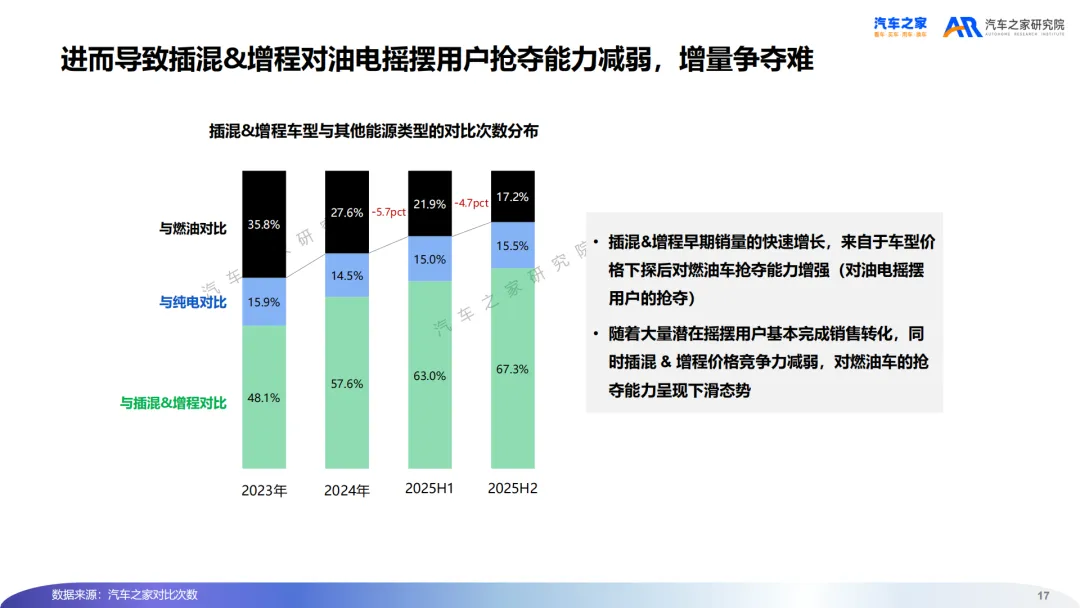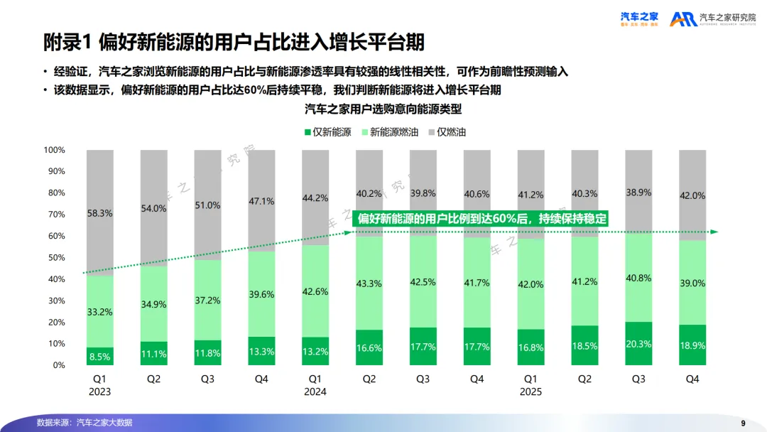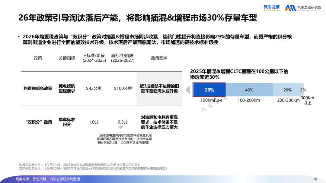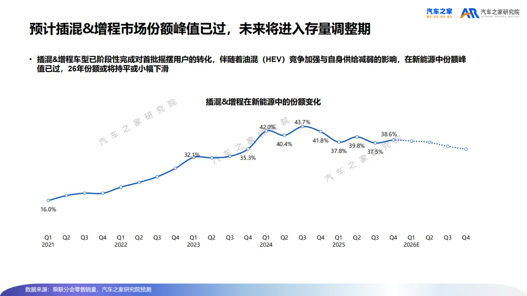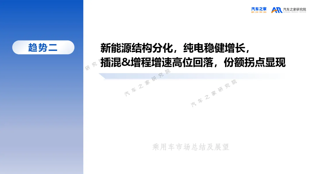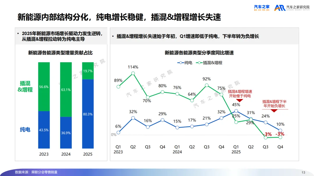 2025 年 “两新” 政策补贴边际效用递减,乘用车销量 2374 万辆,同比仅增 3.8%,月度走势呈 “前高、中平、后低” 且与政策节点高度相关。2026 年政策效用将进一步下降,叠加宏观消费复苏乏力(消费者信心指数低于荣枯线),乘用车销量预计 2400 万辆、增速收窄至 1%;新能源受购置税减半、纯电里程门槛提升等政策影响,销量预计 1415 万辆、渗透率 59%,恐成最后一年两位数增长,且偏好新能源的用户占比达 60% 后进入平台期。 - 新能源结构分化,插混 & 增程份额拐点显现,纯电成增长核心