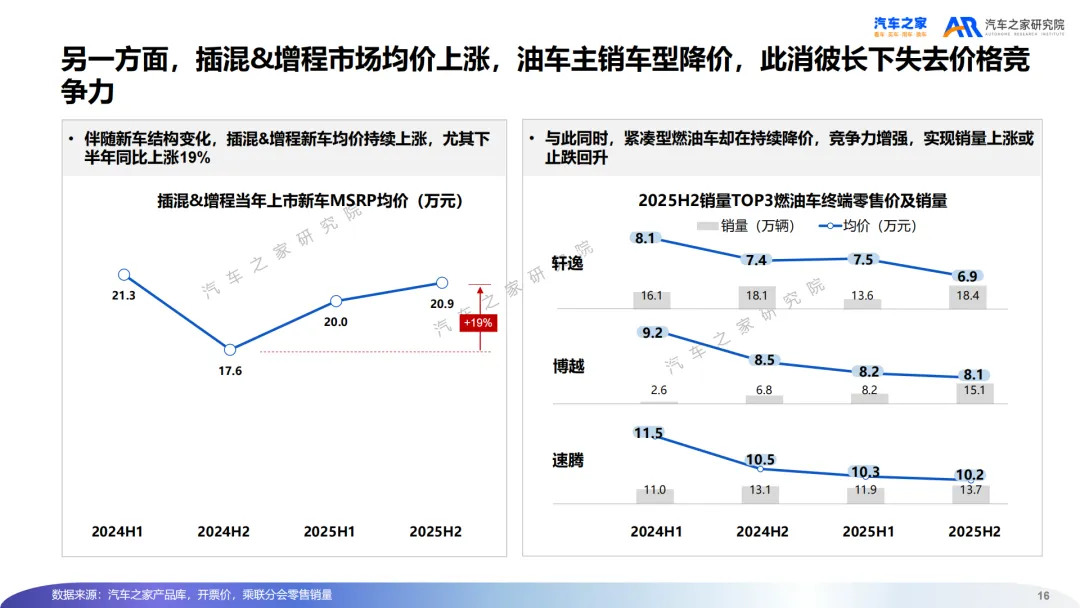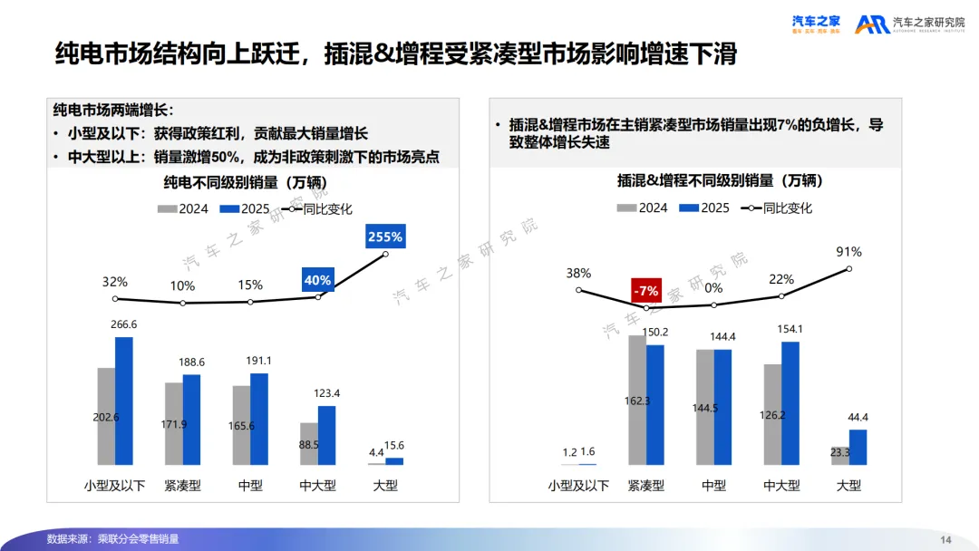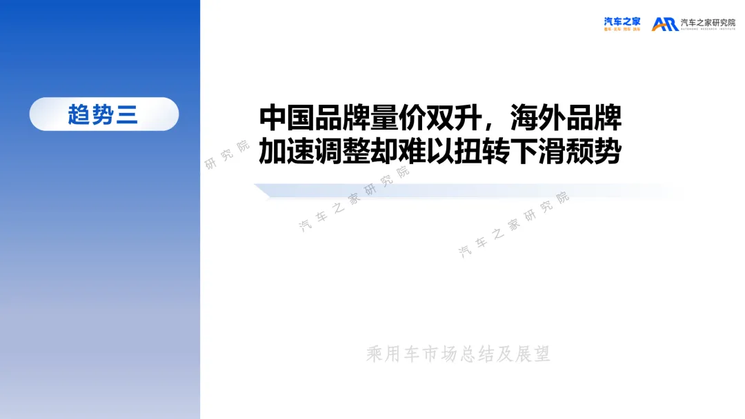 2025 年新能源市场份额首超燃油达 53.9%,但内部结构严重分化:纯电稳健增长,小型及以下车型享政策红利、中大型以上车型销量激增 50%;插混 & 增程年初即增速失速,下半年转为负增长,核心原因是紧凑型新车供给收缩、均价上涨失去价格竞争力,且与燃油车的用户抢夺能力减弱。2026 年购置税和双积分政策收紧,将淘汰近 3 成续航不足 100km 的插混 & 增程存量车型,其市场份额峰值已过,进入存量调整期。 - 中国品牌量价双升,海外品牌调整难挽下滑颓势
