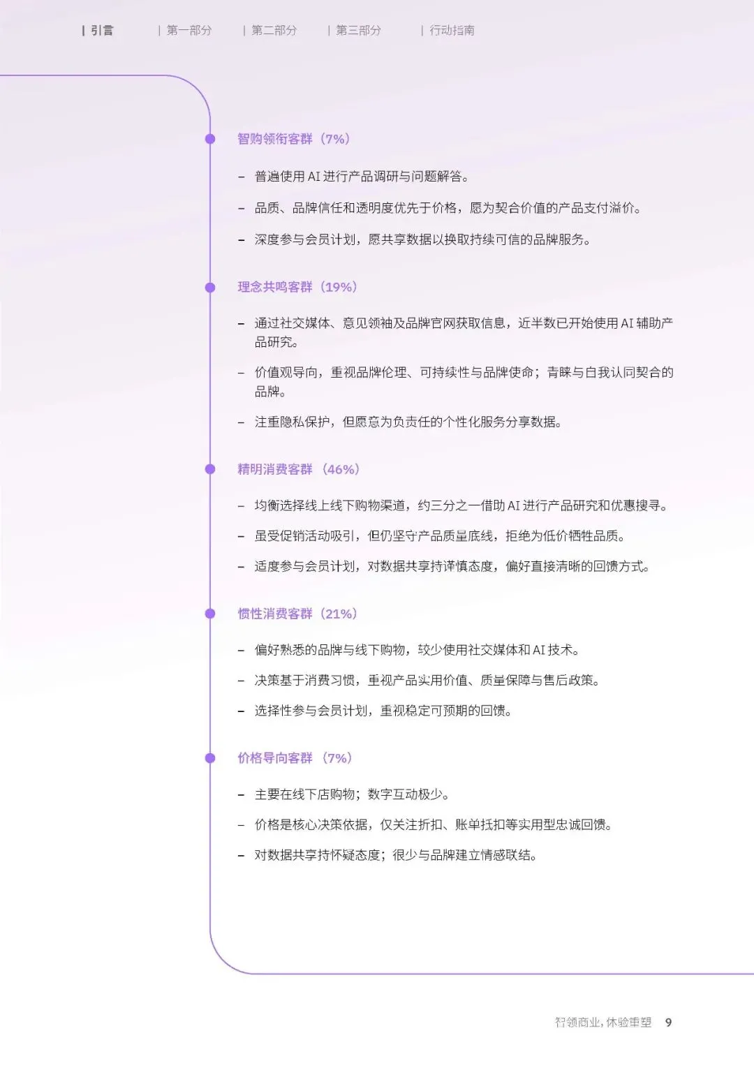 智购领衔客群和价格导向客群,各占 7% 的比例,却代表了消费市场的两个极端。智购领衔客群是 AI 技术的深度使用者,他们普遍会用 AI 进行产品调研与问题解答,在消费决策里,品质、品牌信任和透明度的优先级,远高于价格,愿意为契合自身价值的产品支付溢价。他们会深度参与品牌的会员计划,也愿意共享数据,来换取持续可信的品牌服务。他们是消费市场的先行者,他们的行为,正在预示着未来消费的主流方向。