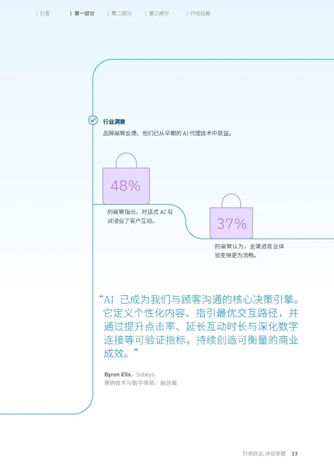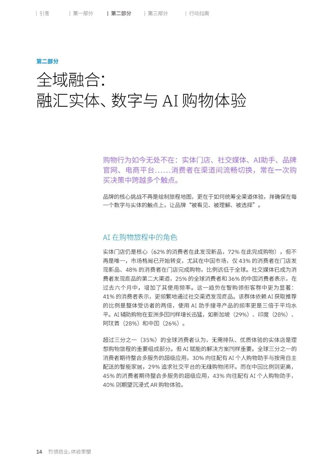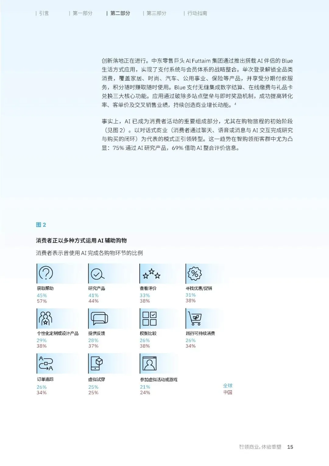 AI 工具已经深度渗透到消费旅程的各个环节,尤其是在购物决策的初始阶段。中国消费者在更多的购物环节里,展现出了对 AI 工具的接受度。38% 的中国消费者会用 AI 进行产品的权衡比较,37% 会用 AI 实现个性化定制或设计产品,34% 会用 AI 进行虚拟试穿,这些比例都显著高于全球平均水平。