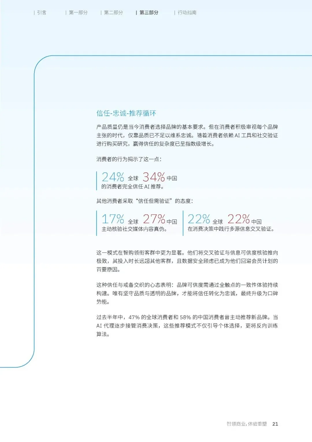 消费者对 AI 推荐的态度,始终是信任与戒备交织。只有 24% 的全球消费者和 34% 的中国消费者,表示自己完全信任 AI 给出的推荐。27% 的中国消费者,会主动核验社交媒体上相关内容的真伪。这种模式在智购领衔客群里,表现得更为极致,他们会在信息交叉验证与可信度核验上,投入远超其他客群的时间与精力,而数据安全方面的顾虑,已经成为他们回避品牌会员计划的首要原因。