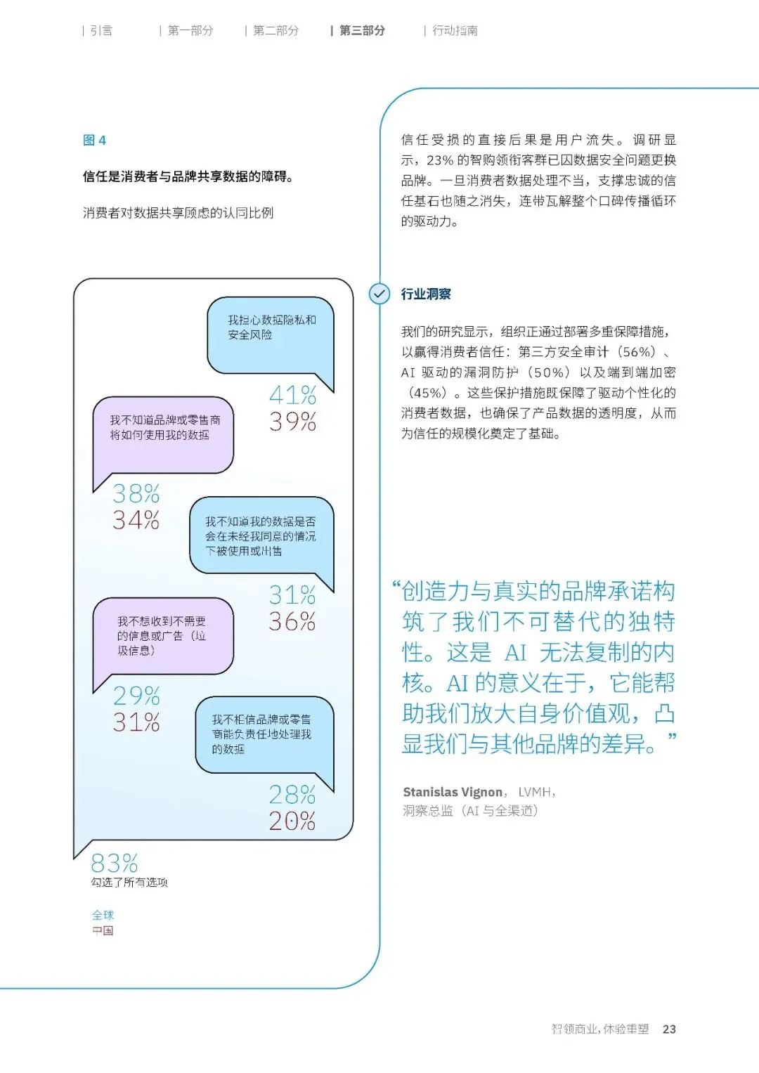 数据是整个信任体系的基石,却也是消费者最大的顾虑来源。52% 的全球消费者和 72% 的中国消费者,对数据分享持开放态度,全球 83% 的消费者,依然深陷隐私安全、数据滥用风险与营销侵扰的多重担忧之中。