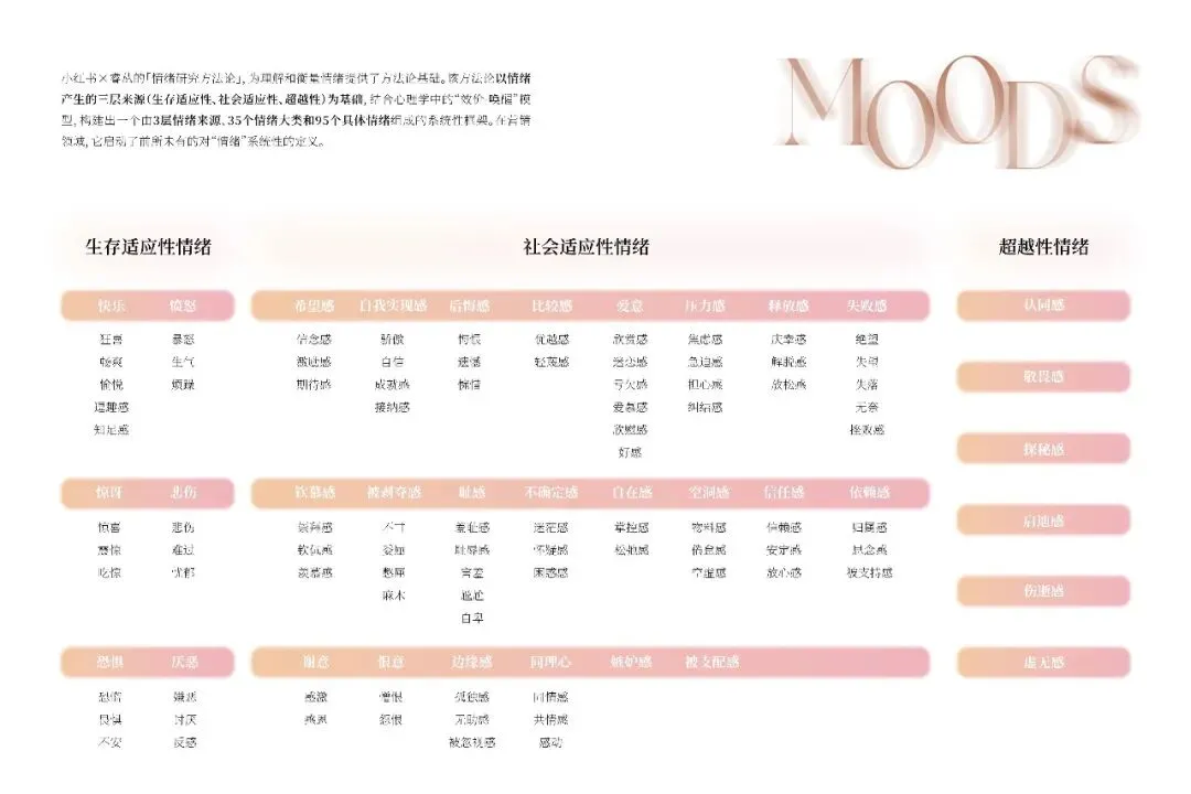 情绪量化体系基于自研AI工具分析20万+笔记,构建含3层来源、35个大类、95种具体情绪的结构化框架,首次将情绪定义为可测量的消费决策要素。 研究范畴覆盖美容护肤、彩妆、香水香薰、头发护理、身体护理、男士护肤六大类目,结合用户、品牌、场景三维度解析情绪动因。