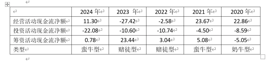 最近几年,企业经营活动产生的现金流不太稳定,有些年份产生的现金流为负值;投资活动产生的现金流一直为负值,说明企业一直在不断投资,导致过往行业景气年份产生的利润又被投入进去;筹资活动产生的现金流为正,说明企业通过外部融资获得现金流流入。