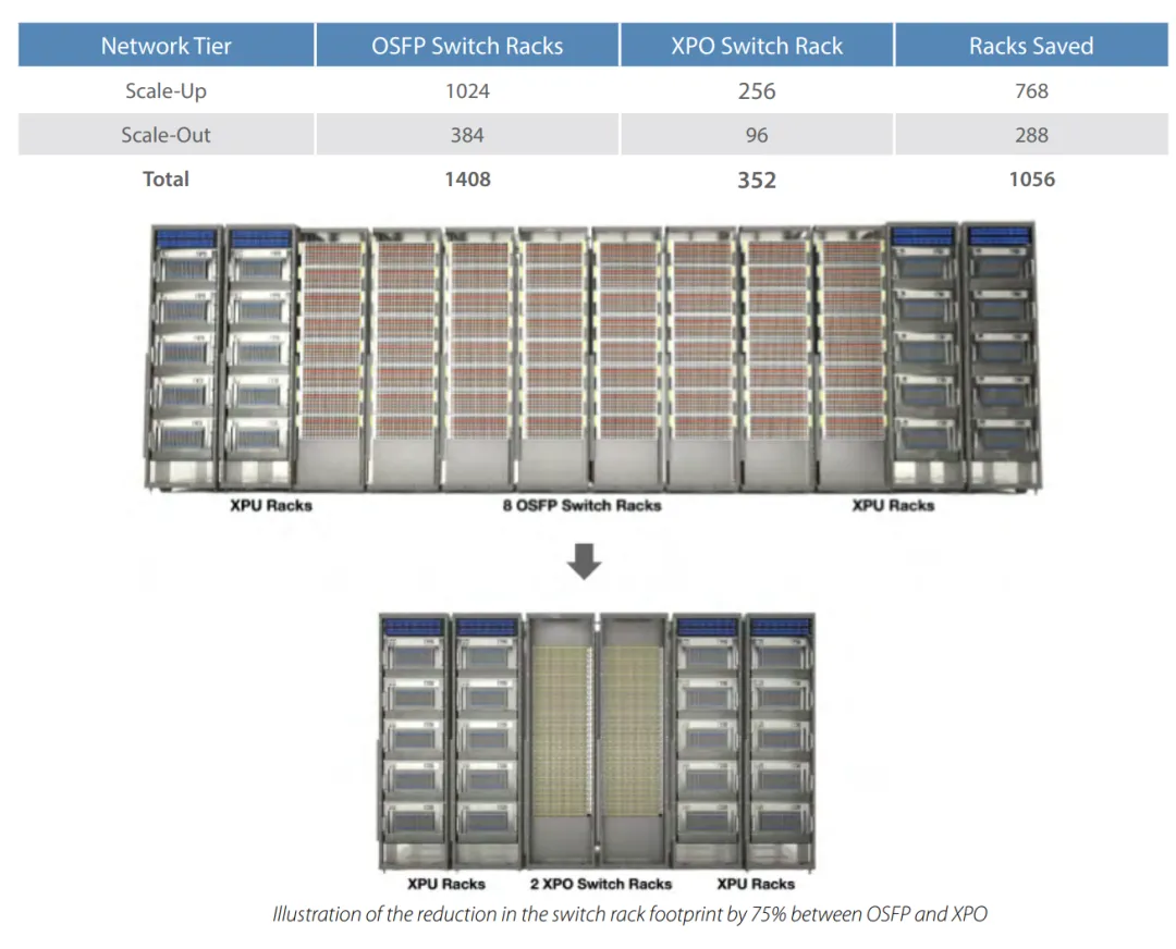 换成 XPO 呢?机架总带宽飙到 6.5 Pbps,能装 32 台交换机,功耗 128kW。带宽密度直接翻了 4 倍。