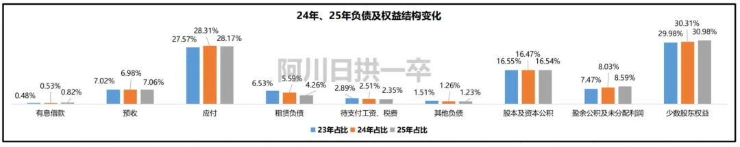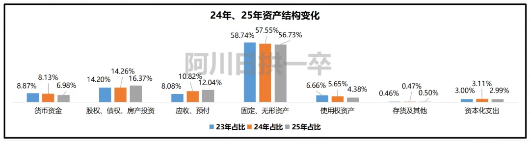 随着折旧摊销、租入资产优化,固定资产、无形资产、使用权资产(租入的办公场所、设备等)比例在下降。