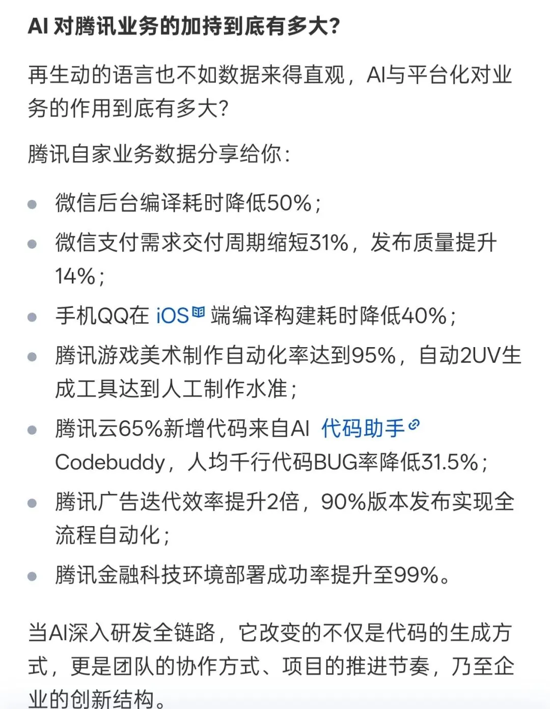 根据财报和媒体报道,腾讯的广告投放操作次数下降80%, 创意操作次数减少47%。AI生成广告文案500万+条,省下内容采购费8亿元。单人素材产出从20条→60条/天,人效提升300%。
