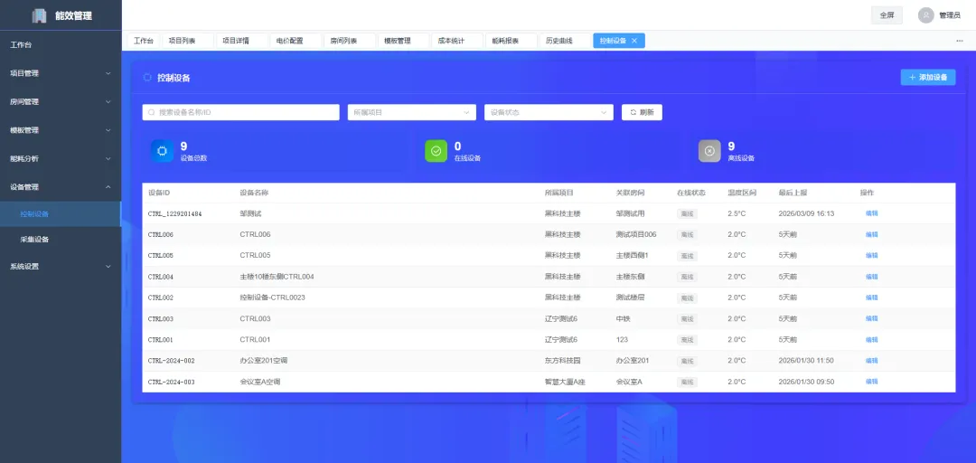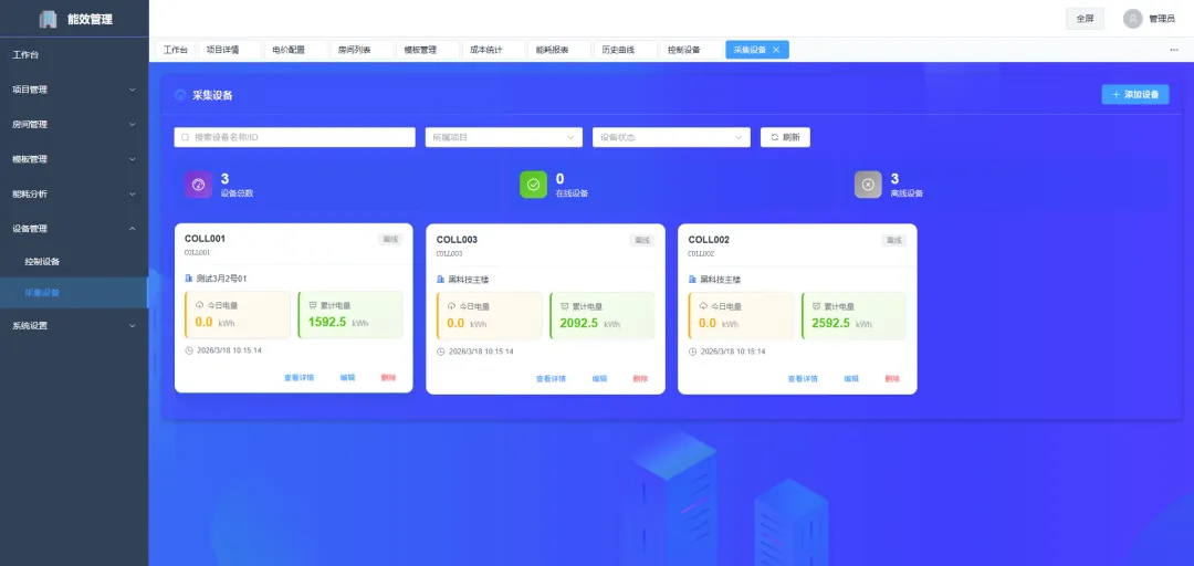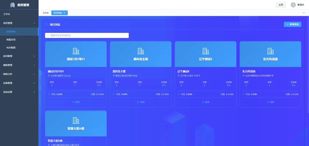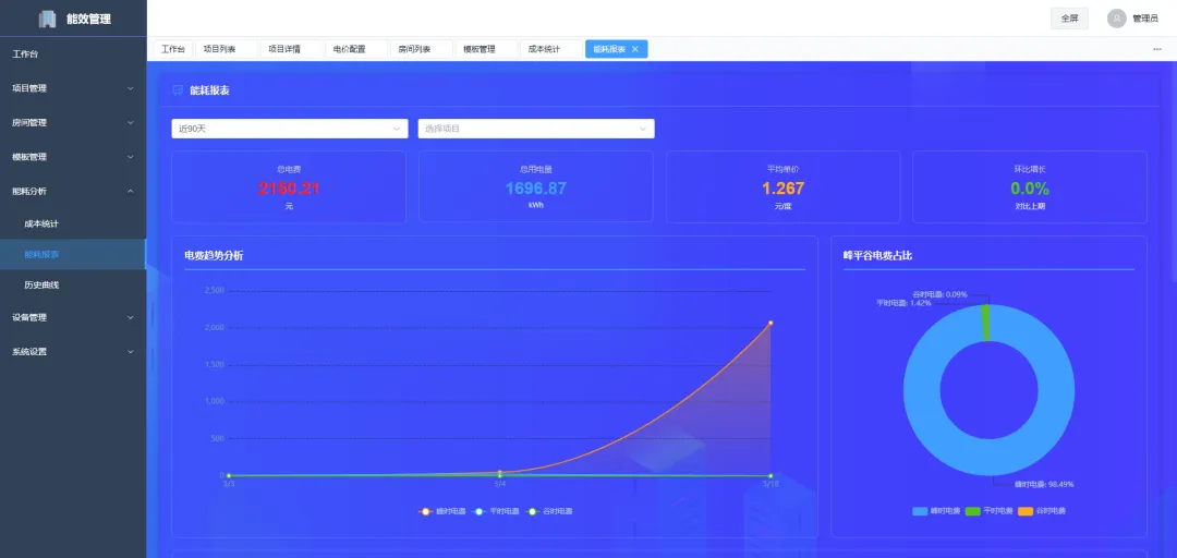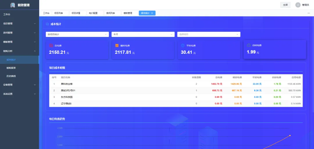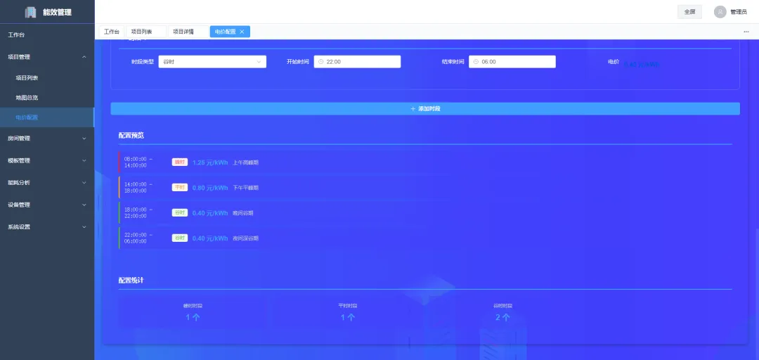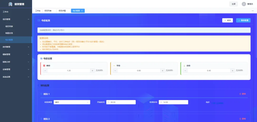 每个项目都可以配置不同的波峰波谷电价,搭配电表采集器每分钟上传的数据,可以准确获得对应项目的电费消耗情况,搭配后续的成本管理模块,可以有效的对运行配置进行优化