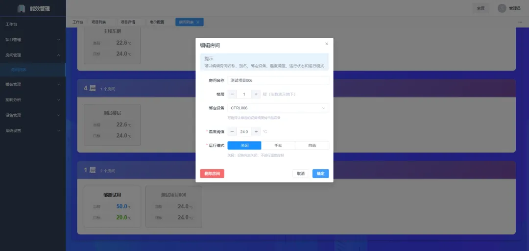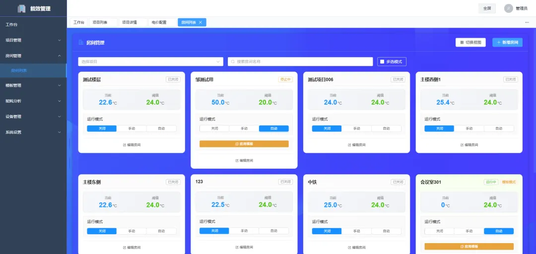 房间管理提供两种视图模式,在卡片视图下,用户可以便捷一键操作对应房间的目标温度和运行状态。楼层视图模式下,用户可以一目了然看到当前项目每层楼设备的运行情况和加热状况。