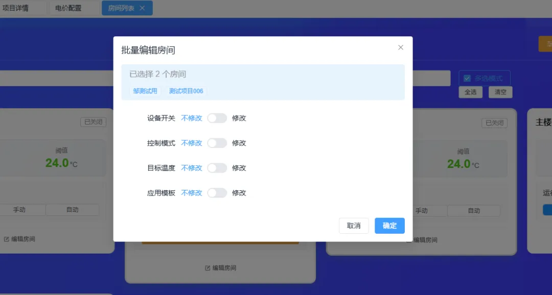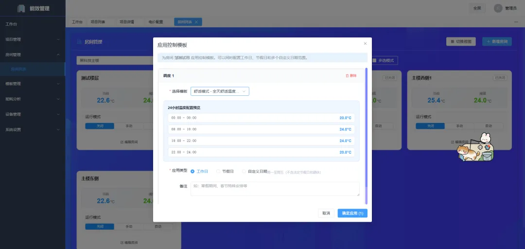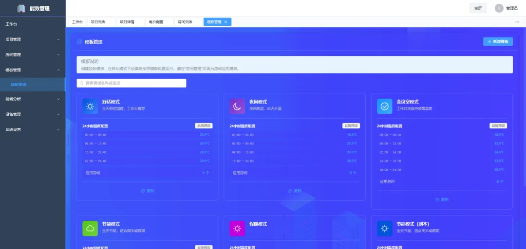 同时,房间可以进行模版的配置,通过选择的工作日或者节假日,来自动进行日期类型判断(符合国家节假日),在对应的日期,会按照对应时段设置好的温度进行运行。确保运行结果符合预期,可以多房间批量配置,一键生效。