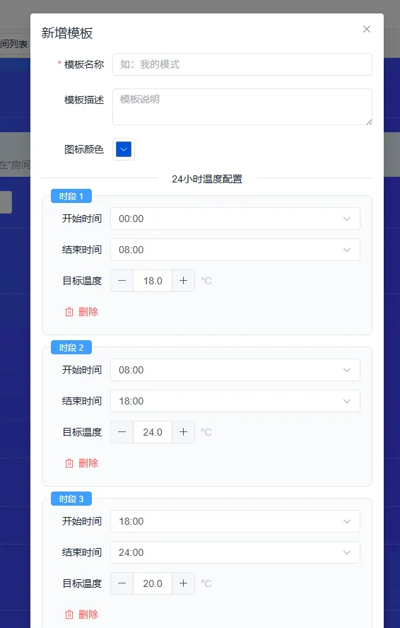 除了系统自带的模版以外,用户可以自定义添加自己所需要的模版,便于更符合实际运行情况,时间段完整覆盖24小时,会有明确的校验规则,避免出现意外状况。