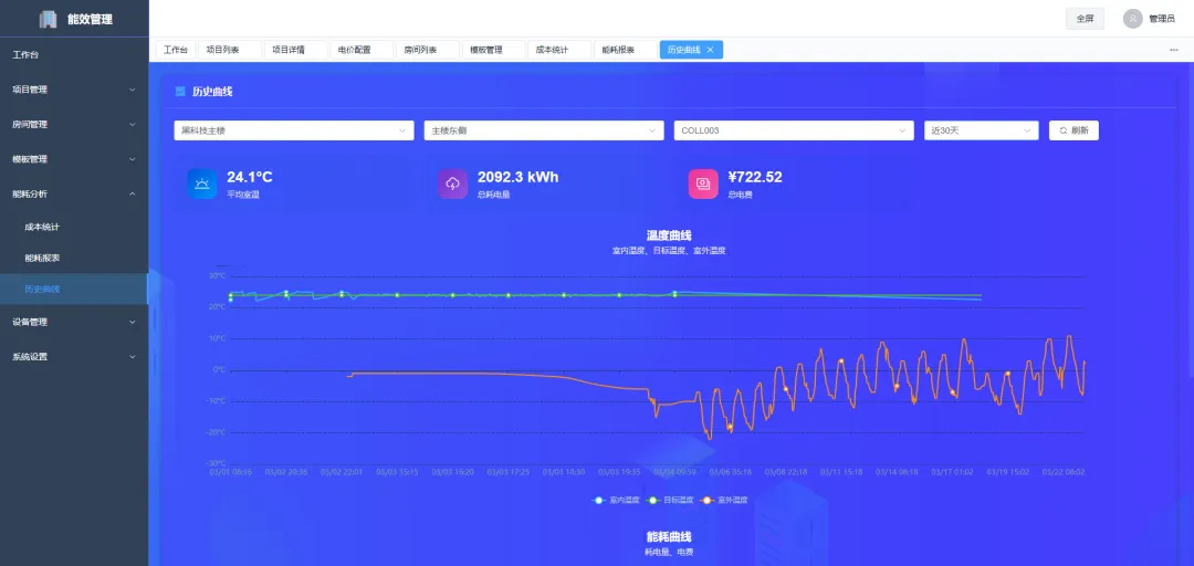 可以分析历史室内温度,室外温度进行对比查看电费的消耗曲线。