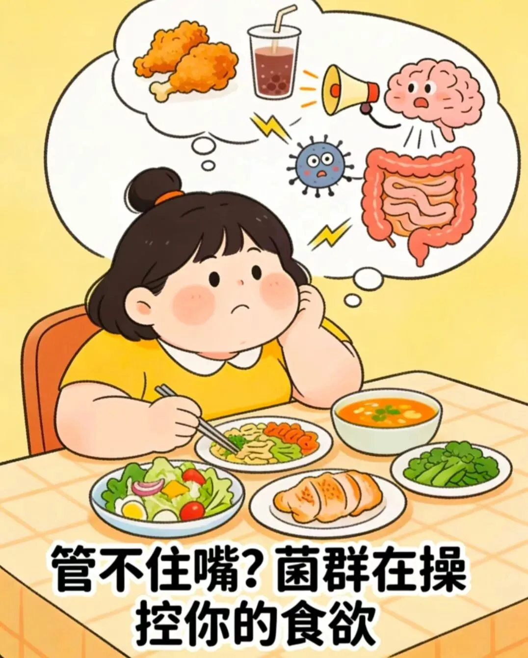 肠道被称为“第二大脑”,通过肠脑轴与大脑直接相连。当有害菌占据优势时,会分泌特殊信号物质传递到大脑,刺激人体产生对高糖、高油、高热量食物的强烈渴望,让人难以控制食欲,出现暴饮暴食、嘴馋不停的情况,即便意志力再强,也很难对抗身体的本能需求,减肥计划频频半途而废。