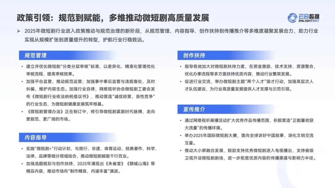 :广电总局推进 “微短剧 +” 行动计划,建立分类分层审核标准,推动大小屏融合;腾讯视频、爱奇艺等平台升级分账规则,提供 IP 授权、资金补贴、资源支持,2025 年厂牌激励金累计超 2000 万,引导内容精品化。 - 行业规模持续扩容但分化加剧