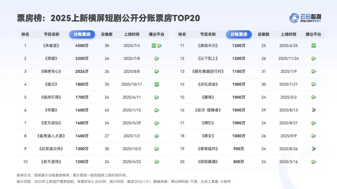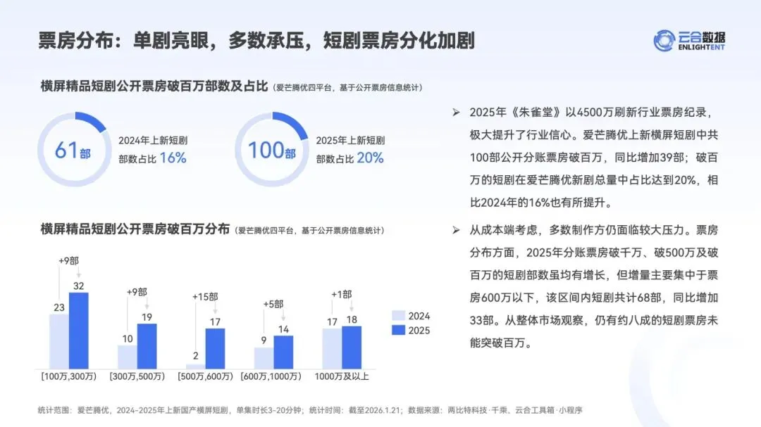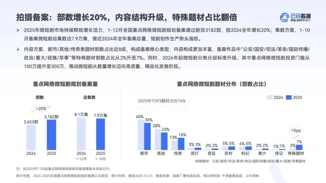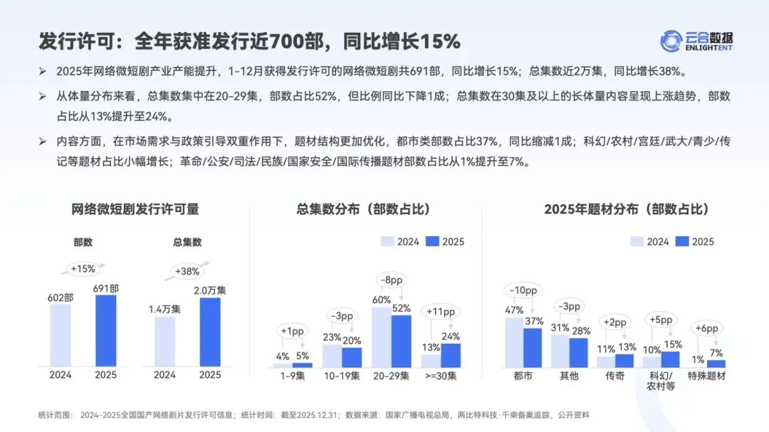:2025 年重点网络微短剧备案 3182 部、发行 691 部,横屏精品短剧上新 527 部,同比增长 31%。公开分账票房达 5.74 亿,《朱雀堂》以 4500 万刷新纪录,但 8 成短剧票房未过百万,头部效应显著。 - 内容结构优化与体量提升