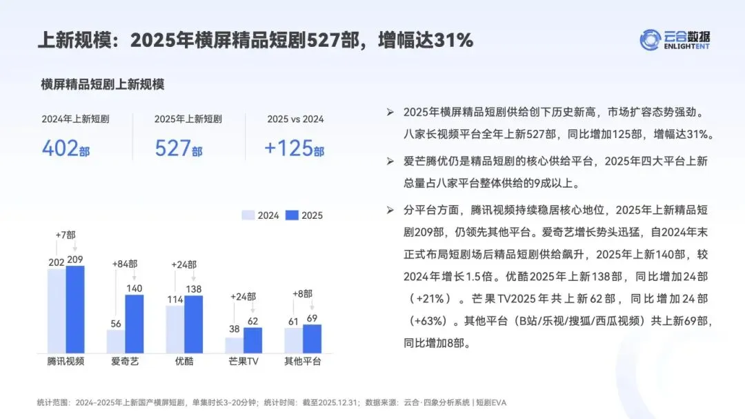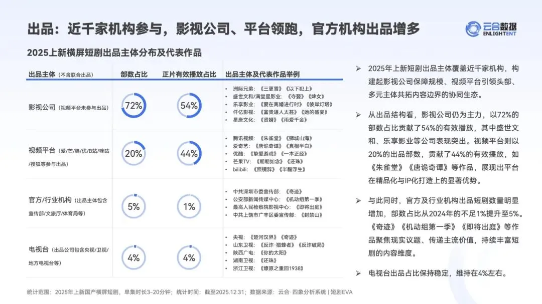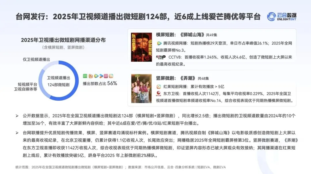 :近千家机构参与出品,影视公司占 72%、视频平台占 20%,官方 / 行业机构出品占比升至 5%。2025 年 124 部微短剧登陆卫视频道,近 6 成实现台网联播,腾讯视频《狮城山海》创下微短剧上大屏最高收视纪录,长尾效应突出。