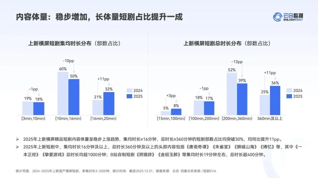 :古言、悬疑题材占有效播放超 6 成,《唐诡奇谭》《朱雀堂》等精品内容单日市占率峰值突破 65%。集均时长≥16 分钟、总时长≥360 分钟的长体量短剧占比提升至 30%,制作精良度向长剧靠拢。 - 发行与排播模式创新