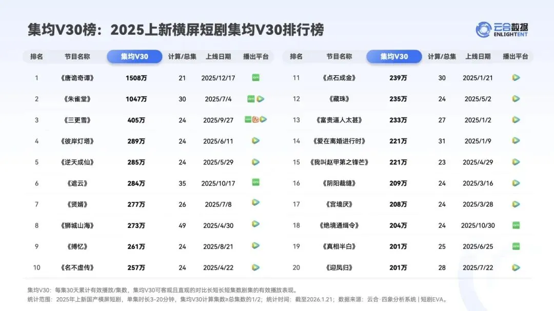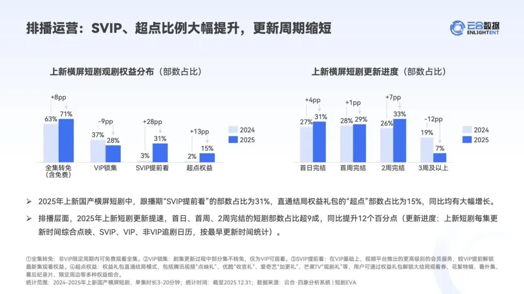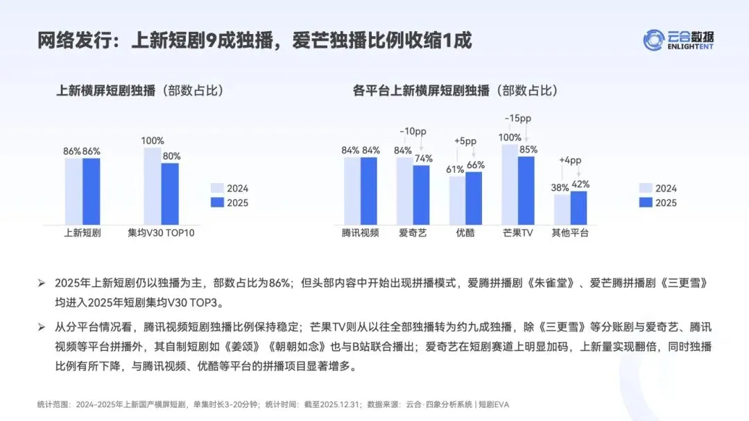 :独播仍是主流(占比 86%),但头部内容出现拼播模式,爱腾拼播《朱雀堂》、爱芒腾拼播《三更雪》均跻身集均 V30 TOP3。排播强化用户分层,SVIP 提前看、超点权益部数占比同比提升 1-3 成,更新周期缩短至 2 周内完结。 - 出品主体多元化与台网融合深化