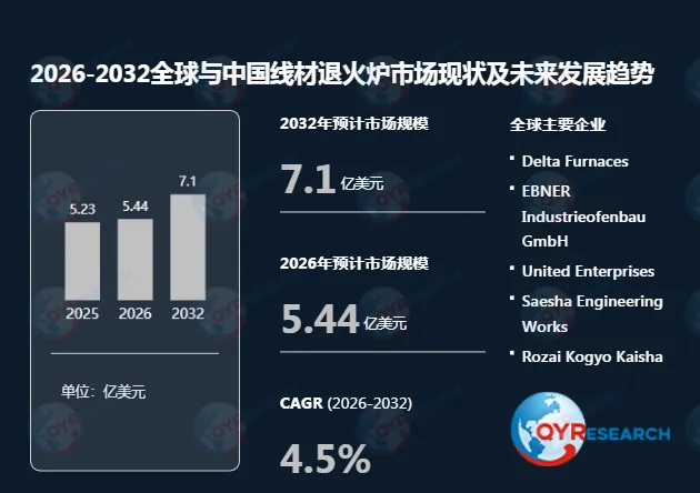 根据QYR(恒州博智)的统计及预测,2025年全球线材退火炉市场销售额达到了5.23亿美元,预计2032年将达到7.1亿美元,年复合增长率(CAGR)为4.5%(2026-2032)。