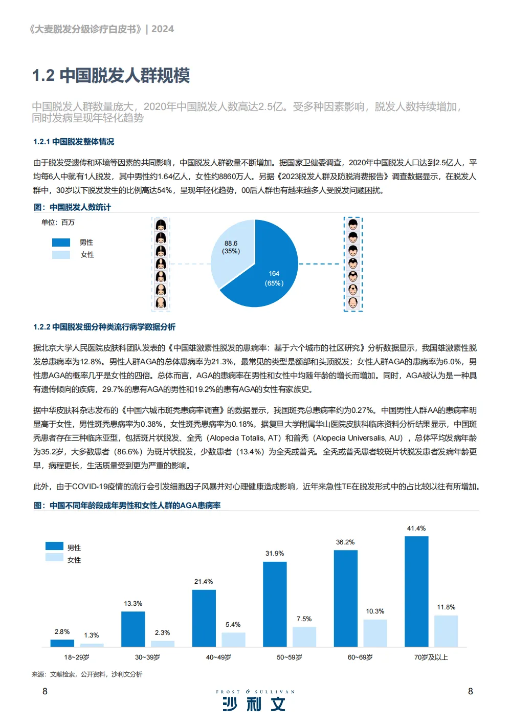 其实中国脱发人群最突出的就是规模大,2020年就有2.5亿人,而且越来越多年轻人被脱发困扰,30岁以下人群占比超过一半。最常见的就是雄激素性脱发,也就是大家常说的AGA,这种脱发总患病率有12.8%,男性患病率是女性的近4倍,男性多是额叶、颞叶和头顶脱发,女性则以中央头皮稀疏为主,而且随着年龄增长,患病率还会提升,不过早期及时识别治疗,就能阻止病情进一步发展,这也是现在很多人关注的头皮健康重点。
